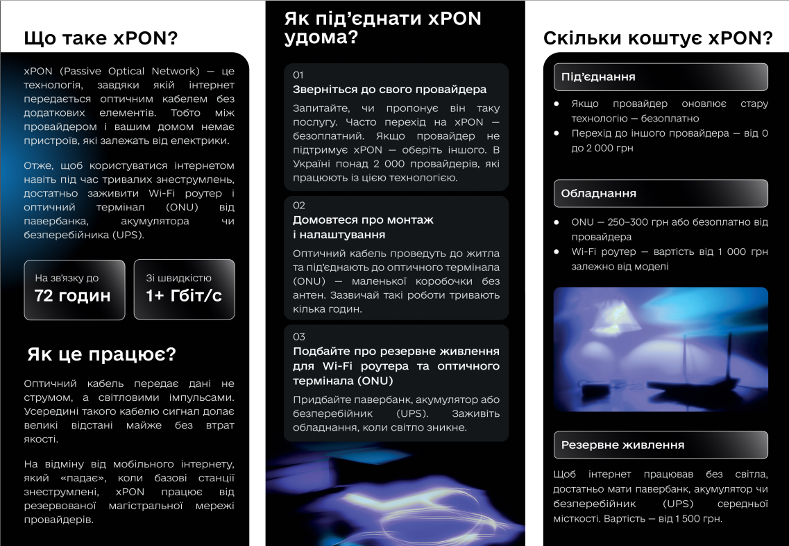 Ось ви вже маєте доступ до оптоволоконного інтернету! Але при відключеннях світла цього замало... Треба мати резервне живлення для свого ONU/ONT терміналу, та Wi-Fi роутера: